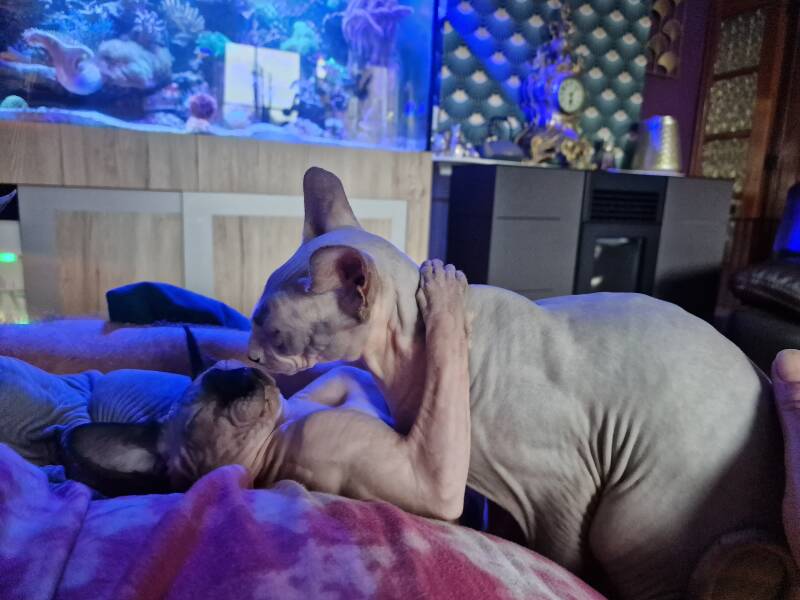 Les Loulous évoluent dans un environnement calme à la campagne, entourés d'autres chats, de chiens, de poissons et un perroquet.
